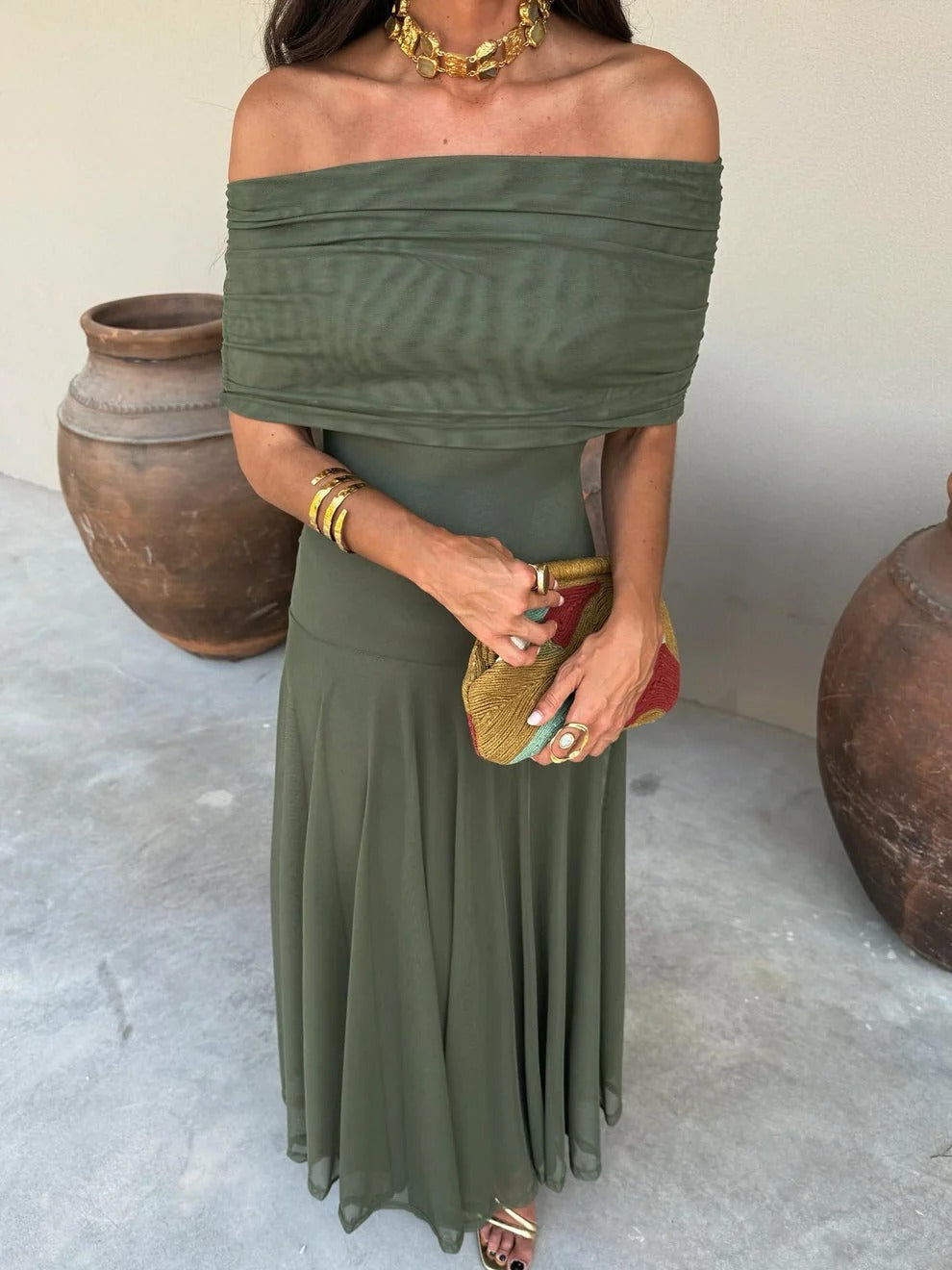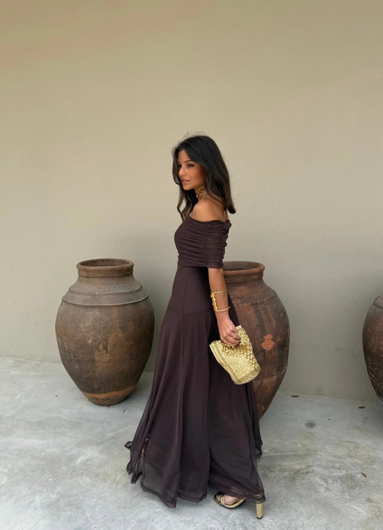 Il chiffon vaporoso cade con grazia lungo la figura, donando freschezza nelle giornate estive e un’eleganza naturale nelle tue serate speciali.